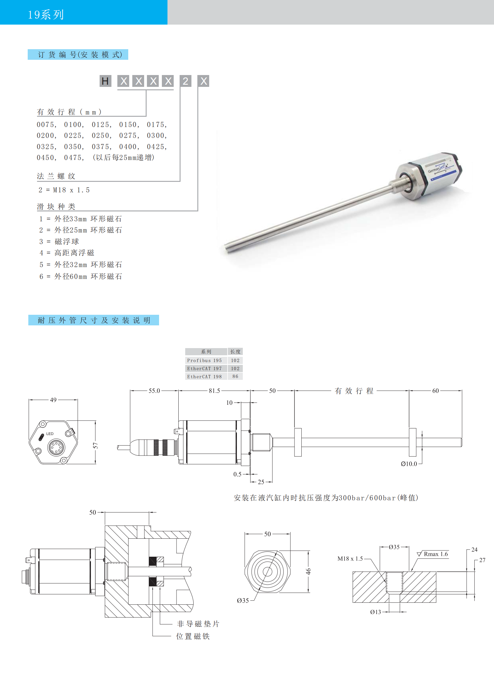 磁致伸縮位移傳感器在產(chǎn)品的性能上是采用非 接觸式磁懸浮測量技術(shù) 。此技術(shù)能提供高精準(zhǔn)、 高可靠性、穩(wěn)定性高、直 接和絕對值的位移輸出 。非接觸式設(shè)計(jì)不但方便 安裝,而且能消除所有工 作磨損而帶來的誤差,無須重新標(biāo)定,無須定期維護(hù)